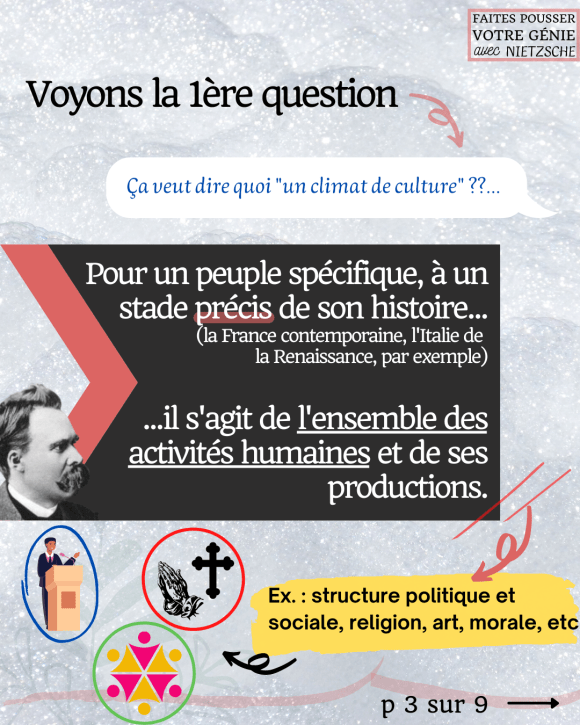 La Clé 2 approfondit la notion nietzschéenne de « climat de culture » et vous donne des indications vous permettant d’analyser le vôtre. Mener une telle analyse permet d’identifier des éléments de votre « climat » qui sont peut-être susceptibles de vous freiner dans la pleine croissance de votre génie.