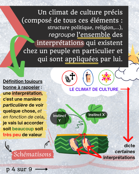 Un climat de culture précis (composé de tous ces éléments : structure politique, religion,…), regroupe l’ensemble des interprétations qui existent chez un peuple en particulier et qui sont appliquées par lui.