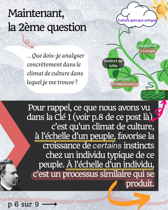 Pour comprendre comment notre « climat de culture » nous influence, revenons sur la notion de « plante-instinct » que nous avons évoqué dans la Clé 1. L’instinct social est une plante-instinct par exemple, tout comme l’instinct de peur ou l’instinct de lutte. Dans un contexte nietzschéen, parler de « plante-instinct » sert à se représenter l’individu lui-même comme une terre cultivable où poussent des « plantes », c’est-à-dire des instincts spécifiques comme ceux que l’on vient de mentionner (peur, lutte).