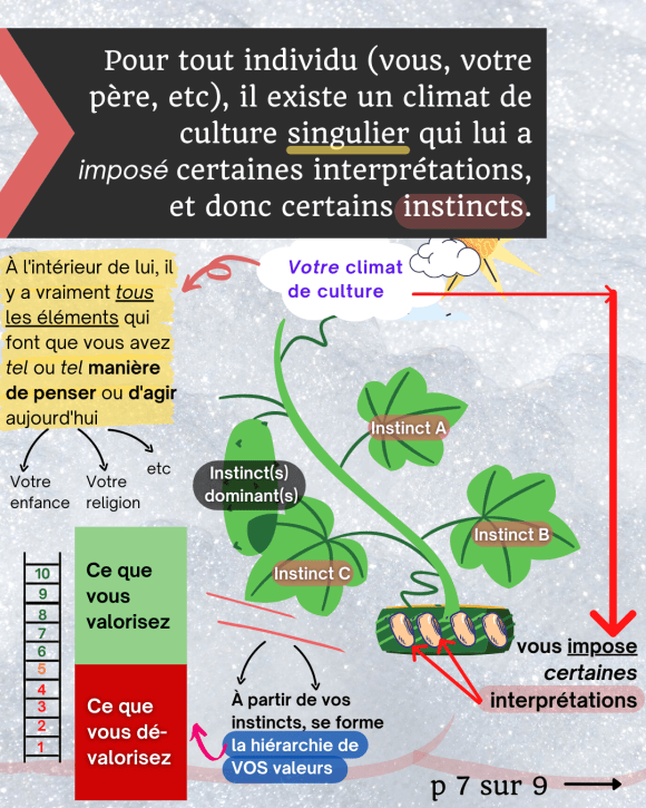 Comme nous venons de le voir, notre climat de culture regroupe l’ensemble des interprétations en vigueur autour de nous. Ces interprétations qui nous viennent de notre climat de culture déterminent nécessairement notre manière de penser & d’agir, ce qui revient à dire, en d’autres termes, que .les interprétations que nous impose notre climat de culture déterminent les INSTINCTS qui vont grandir en nous..