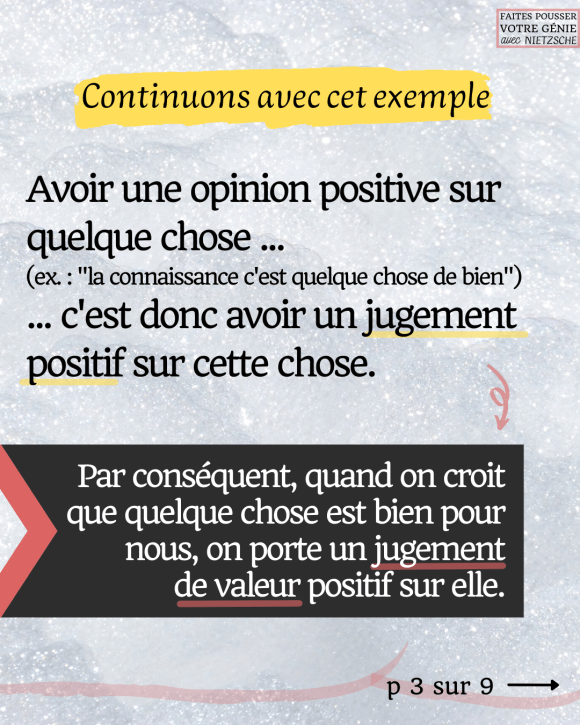Avoir une opinion positive sur quelque chose (ex. : « la connaissance c’est quelque chose de bien »), c’est avoir un jugement positif sur cette chose.