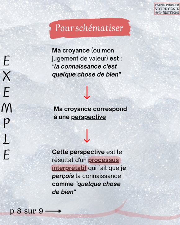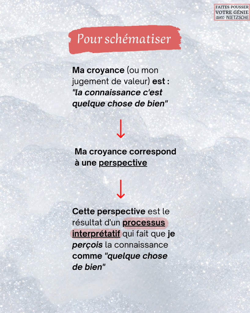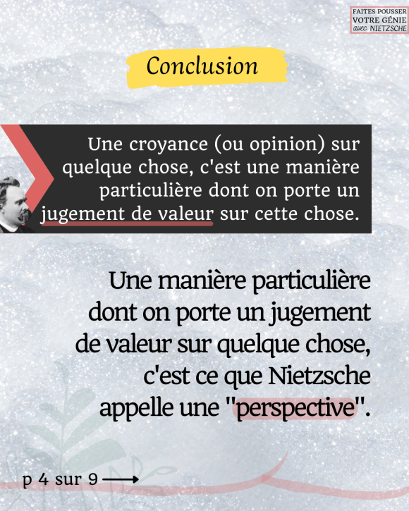 Comme nous venons de le voir, une croyance implique toujours un jugement de valeur. Dans le vocabulaire nietzschéen, le mot perspective signifie une manière particulière dont on porte un jugement de valeur sur quelque chose.