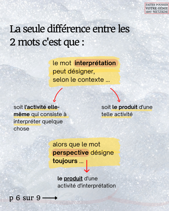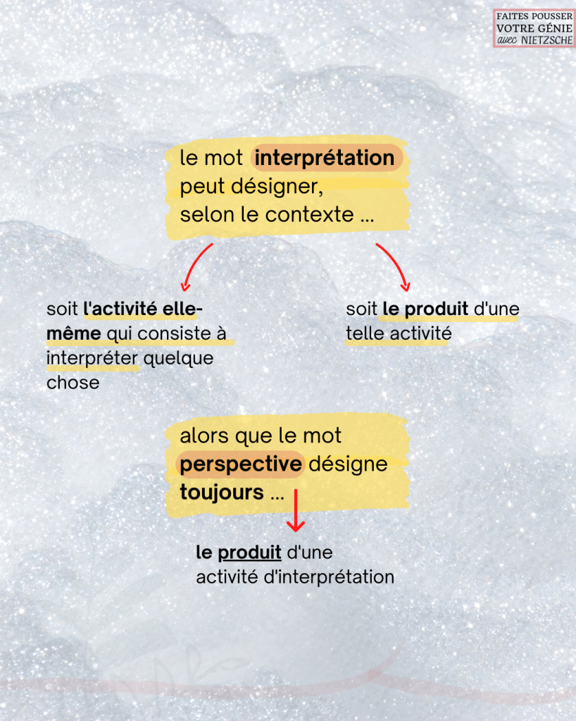 À retenir : une perspective, pour Nietzsche, résulte toujours d’une activité d’interprétation. En d’autres termes, quand un homme interprète quelque chose, il « produit » une perspective.