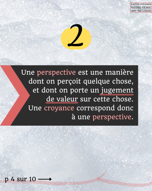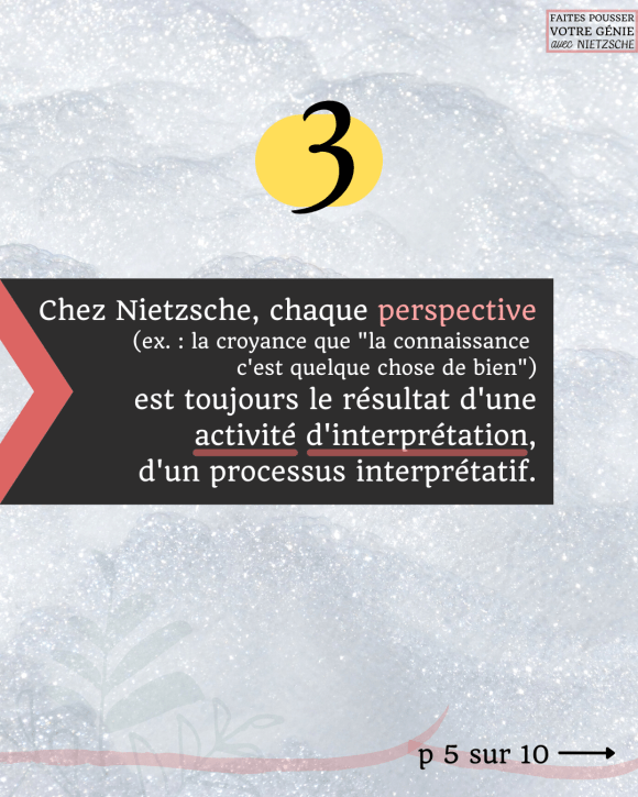 - Chez Nietzsche, chaque perspective (ex. : la croyance que « la connaissance c’est quelque chose de bien ») est toujours le résultat d’un processus interprétatif, d’une activité d’interprétation.