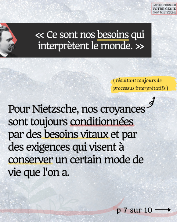 Cette citation de Nietzsche nous montre donc que ce sont nos besoins qui dirigent nos processus interprétatifs, et donc nos croyances. Autrement dit, pour le philosophe, .nos croyances sont toujours conditionnées par des besoins vitaux et par des exigences qui visent à conserver un certain mode de vie que l’on a..