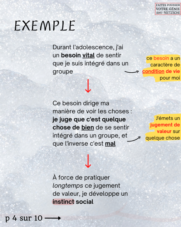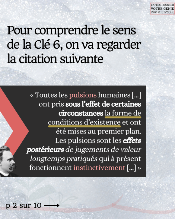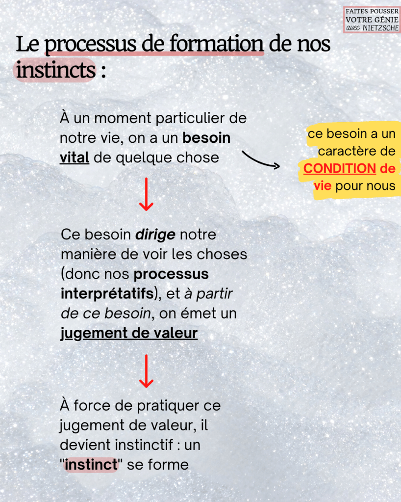 Toutes les pulsions humaines […] ont pris sous l’effet de certaines circonstances la forme de conditions d’existence et ont été mises au premier plan. Les pulsions sont les effets postérieurs de jugements de valeur longtemps pratiqués qui à présent fonctionnent instinctivement […]