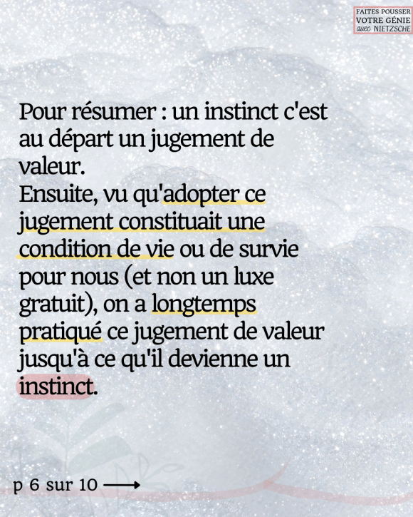 Un instinct (ou pulsion) est au départ un jugement de valeur. Ensuite, vu qu’adopter ce jugement constituait une CONDITION de vie ou de survie pour nous (et non un luxe gratuit), on a longtemps pratiqué ce jugement de valeur jusqu’à ce qu’il devienne un instinct.
