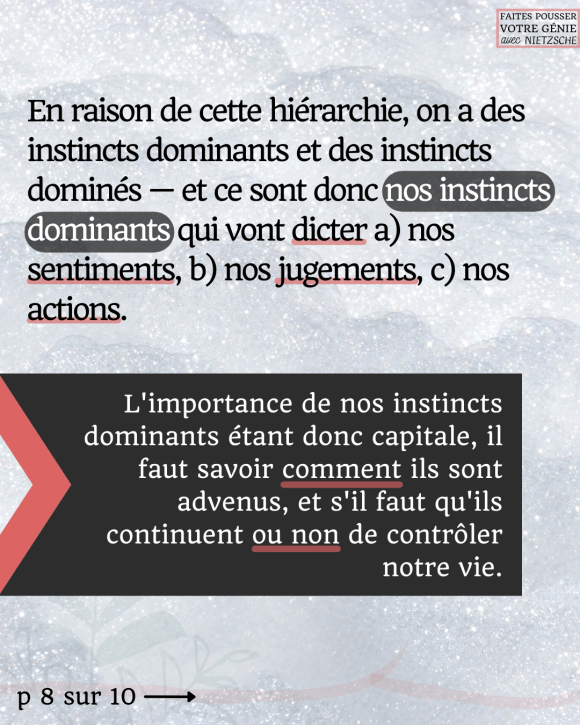 La question que l’on pourrait se poser à propos d’un instinct dominant, c’est : .de quel besoin vient mon instinct dominant ?. est-ce un besoin qui traduit une surabondance de vitalité, de force OU est-ce un besoin qui traduit un appauvrissement de force, un désir d’éviter tout inconfort et toute résistance ?