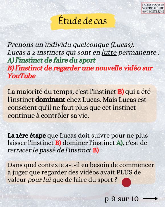 Reprenez l’étude de cas, et choisissez vous-aussi 2 instincts dans votre vie qui sont en lutte permanente : lequel des 2 domine le plus ? Posez-vous ensuite la question :