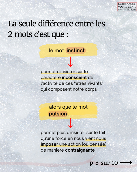Dans le vocabulaire de Nietzsche, « instincts » et « pulsions » désignent la même chose : des forces qui vivent en collectivité au sein du corps humain, organisées dans une structure hiérarchique. En d’autres termes, le corps humain est à comprendre comme une collectivité d’êtres vivants qu’on peut nommer « instincts » ou « pulsions ».