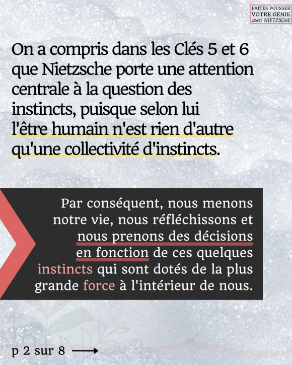 La Clé 7 introduit la notion de « force d’un instinct » et vous permet de comprendre le processus de croissance de vos instincts afin que vous puissiez ensuite le piloter vous-même.