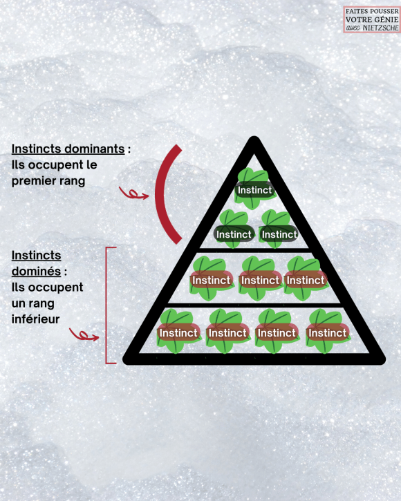 Comme nous l’avons vu dans la Clé 5, il faut, selon Nietzsche, envisager notre être comme rien d’autre qu’une collectivité d’instincts hiérarchisés. Nous avons donc des instincts dominants — des instincts qui sont dotés d’une très grande force en nous — et des instincts dominés — des instincts dont le degré est force est faible.