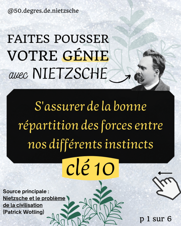 La Clé 10 consiste en la hiérarchisation de nos instincts : cette hiérarchie est nécessaire car il faut éviter la dispersion de nos forces dans plusieurs directions, vers plusieurs instincts antagonistes. En effet, dans un contexte nietzschéen, on peut dire qu’on ne dispose que d’un « capital » de forces limité.