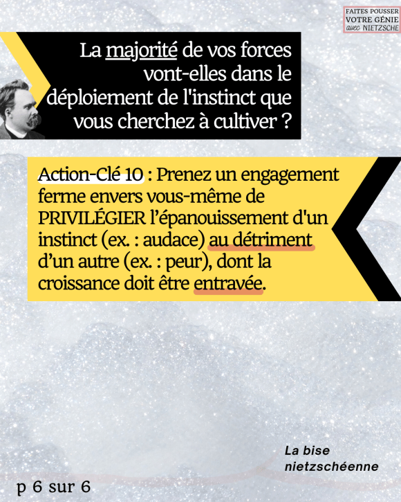 Prenez un engagement ferme envers vous-même de PRIVILÉGIER l’épanouissement d’un instinct (ex. : audace) au détriment d’un autre (ex. : peur), dont la croissance doit être entravée.