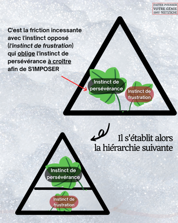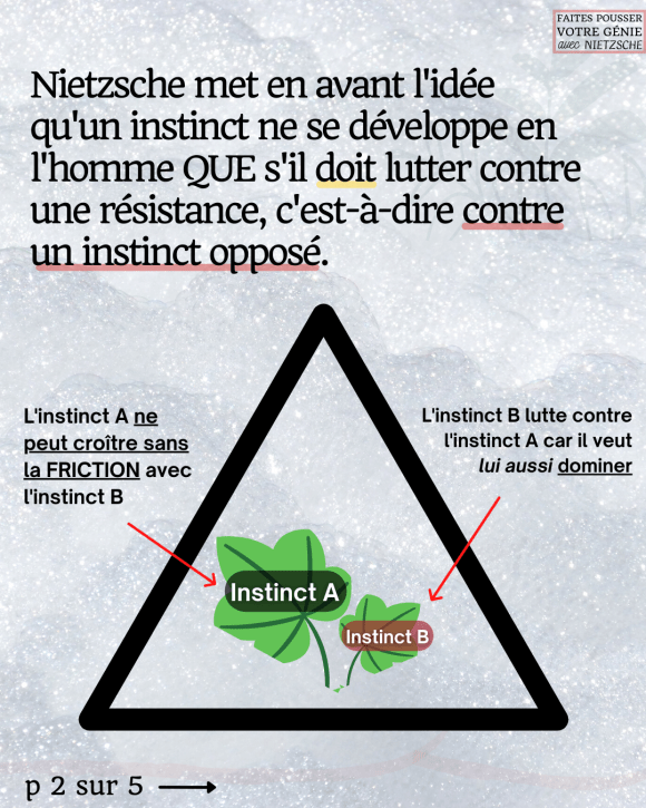 Nietzsche met en avant l’idée qu’un instinct ne se développe en l’homme que s’il doit lutter contre une résistance, c’est-à-dire contre un instinct opposé.