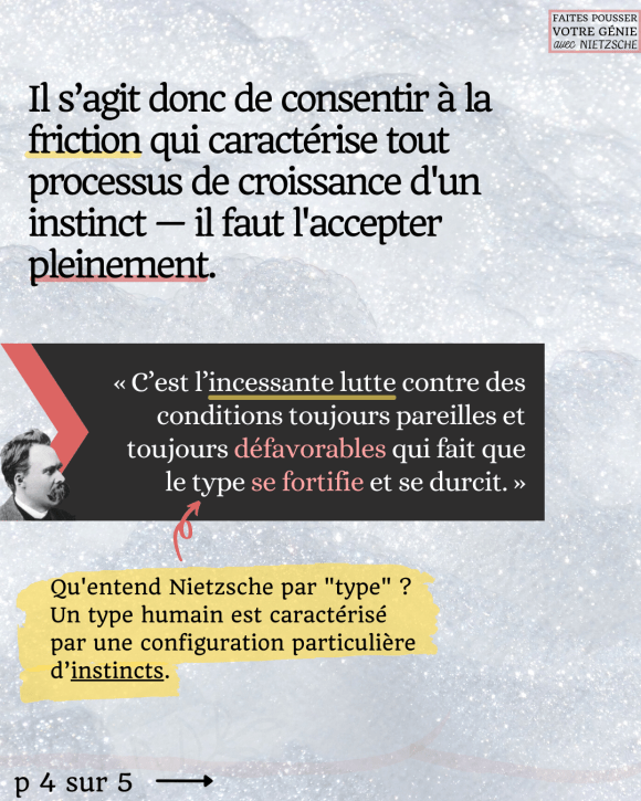 Pour Nietzsche, il est donc nécessaire de consentir à la friction qui caractérise tout processus de croissance d’un instinct — il faut l’accepter pleinement.
