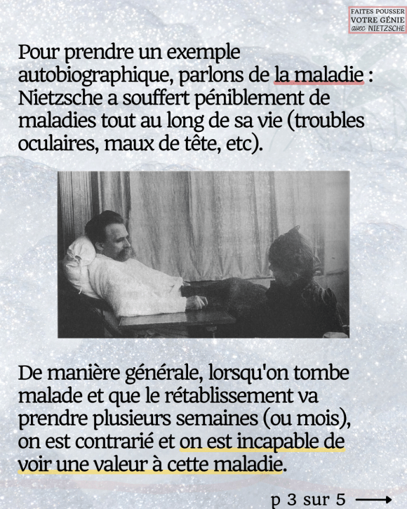 Pour prendre un exemple biographique, parlons de la maladie : Nietzsche a souffert péniblement de maladies tout au long de sa vie (troubles oculaires, maux de tête, etc).