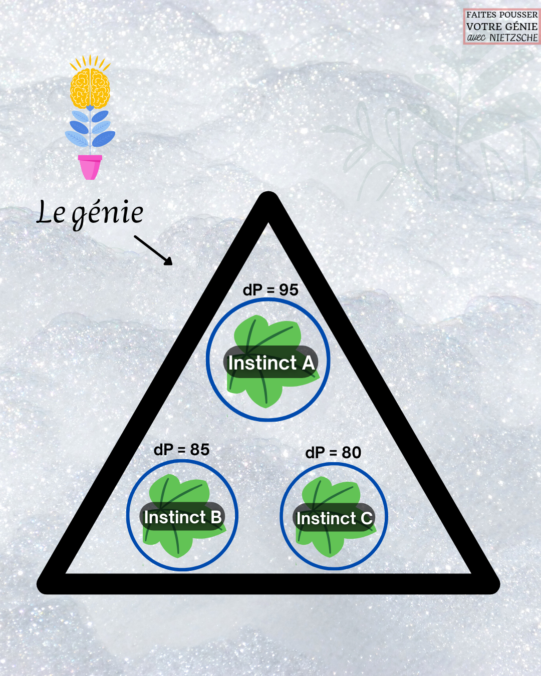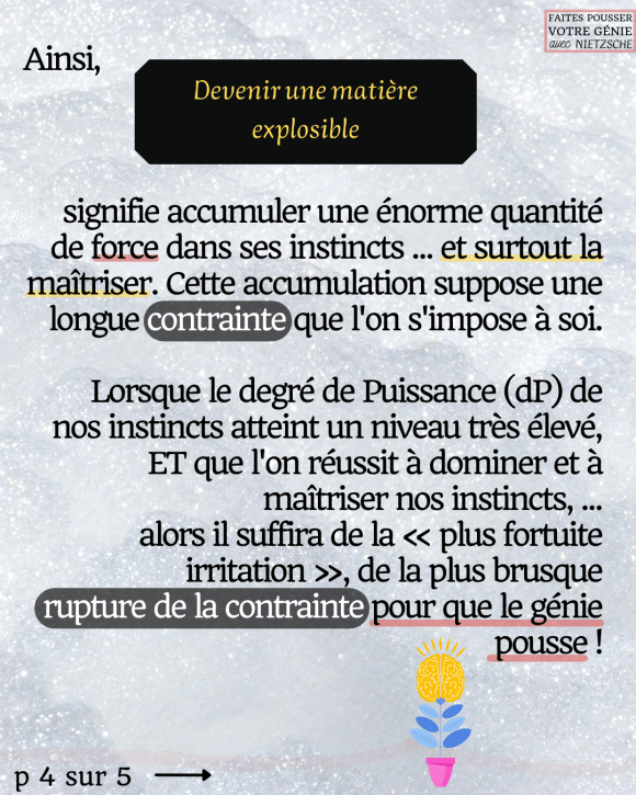 Lorsque le degré de Puissance (dP) de nos instincts atteint un niveau très élevé, ET que l’on réussit à dominer et à maîtriser nos instincts, … alors il suffira de la « plus fortuite irritation », de la plus brusque rupture de la contrainte pour que le génie pousse !